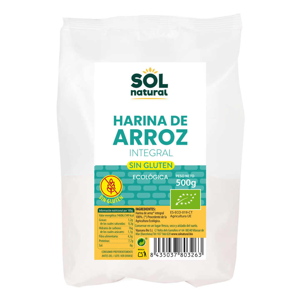 La Harina de Arroz Integral Sin Gluten de Sol Natural en formato de 500 gramos es una alternativa versátil y saludable para cocinar y hornear sin recurrir al trigo ni a otros cereales con gluten.